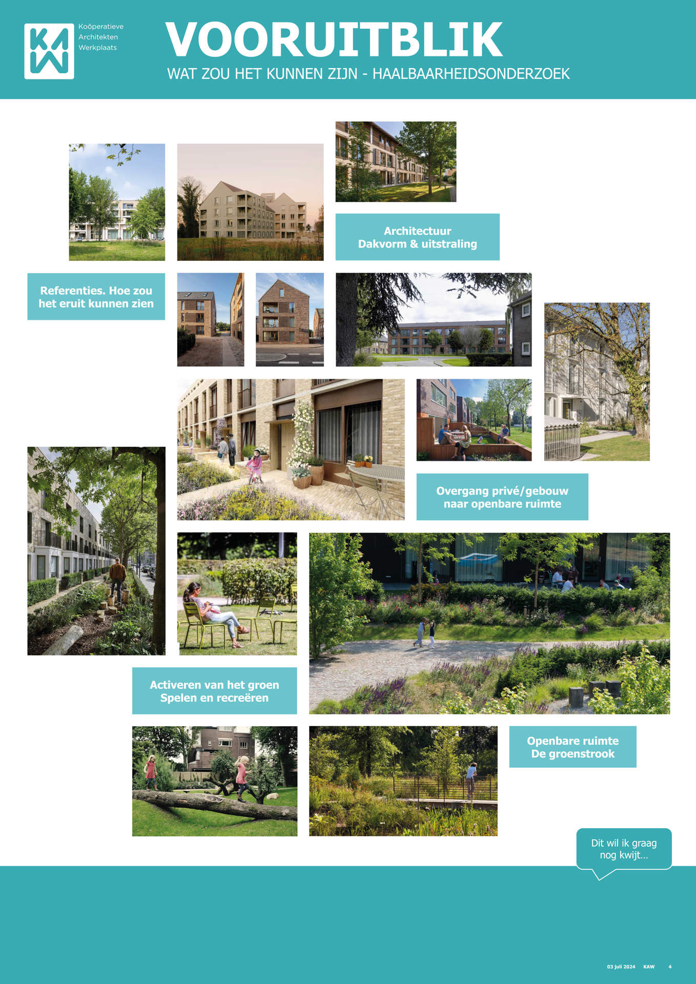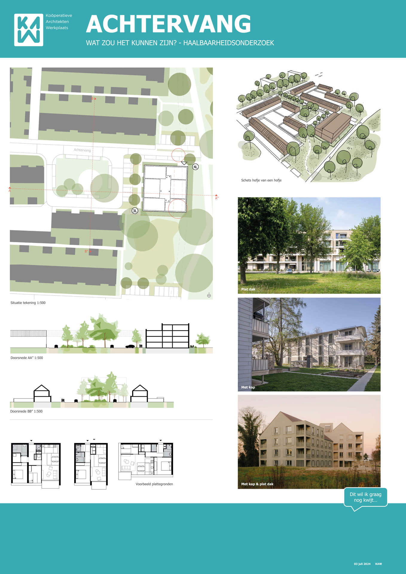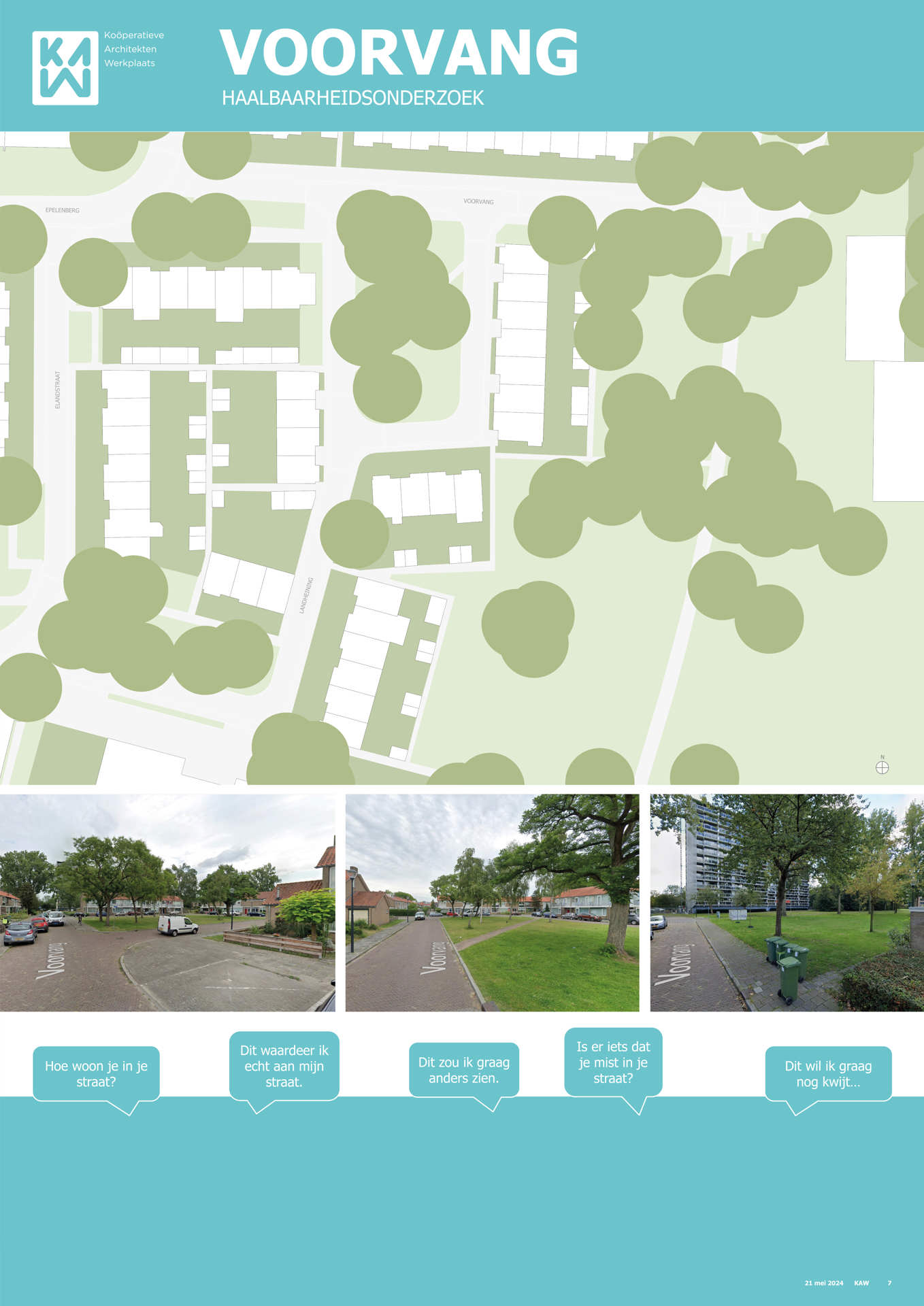 Samen met buurtbewoners, de gemeente, KAW architecten en Maas-Jacobs Vastgoed hebben we gesproken over de toekomst van de buurt: het gebied in en rondom de woningen aan de Achtervang, Uitvang, Bijvang en Voorvang in Breda. In 2024 vond hier een haalbaarheidsonderzoek plaats naar de mogelijkheden om gezinswoningen te vervangen door appartementen in verschillende prijsklassen, waarbij ook de kwaliteit van het gebied verbeterd kan worden. In het onderzoek is gekeken naar manieren om hitte en wateroverlast tegen te gaan en de groenstrook beter in te richten. Tevens kan de nieuwbouw een voorkant krijgen aan de groenzone tussen Brabantpark en Heusdenhout, waardoor de sociale controle in de groenzone verbetert.