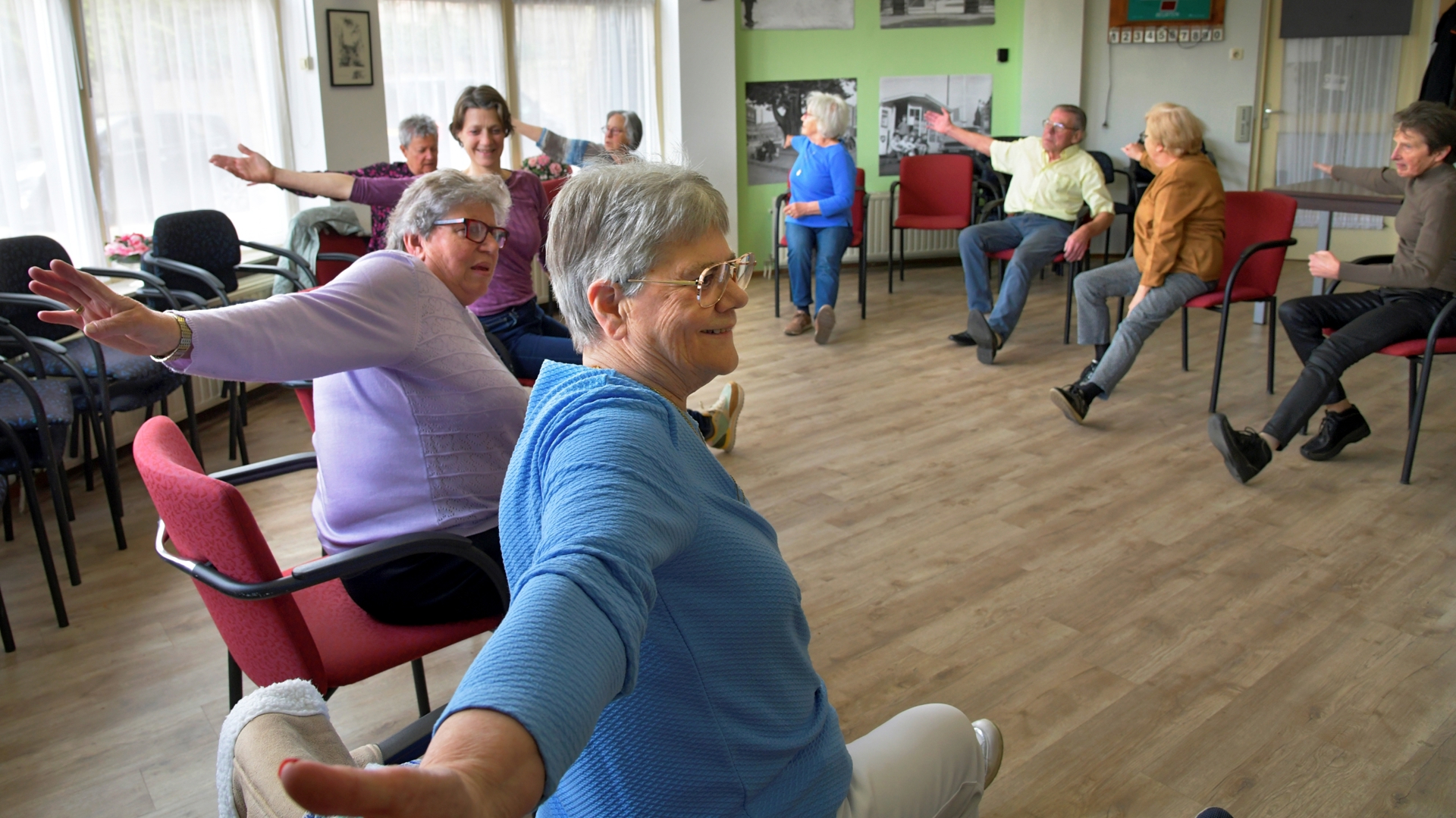 Iedere woensdagochtend bruist het van gezelligheid in de ontmoetingsruimte van de Tivolihoek-flat. Dan komt een aantal leden van seniorenvereniging Tilburg Oost samen om lekker te bewegen. Onder leiding van bewegingsdocent Albertine doen de deelnemers oefeningen op muziek, werken ze aan hun evenwicht en wordt er vooral heel veel gelachen.