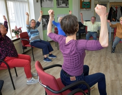 Het laatste nummertje speelt, terwijl de groep nog wat rustige afsluitoefeningen doet. Met de benen omhoog en omlaag. Met de armen van links naar rechts. En het hoofd op en neer. Dan zit het bewegingsuurtje erop en komt de koffie op tafel. “Met een kuukske erbij natuurlijk”, lacht een deelneemster.