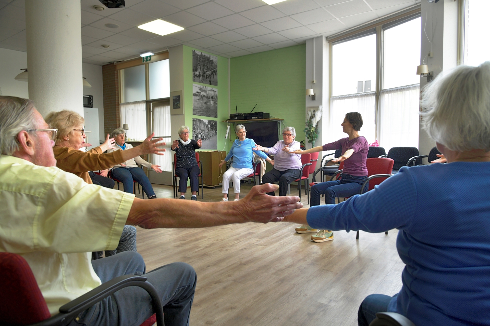 “Zijn er nog verzoekjes?”, vraagt Albertine aan de groep. “Ja! Die van de Beach Boys”, roept een dame. De deelnemers zijn tussen de 70 en 85 jaar oud, en iedereen beweegt op zijn eigen tempo en niveau. De een maakt de bewegingen heel groot, de ander doet het wat rustiger aan. “En dat is prima”, zegt Albertine. “Hier gaat het erom dat iedereen mee kan doen. Dat de deelnemers plezier hebben in het bewegen. Want dat is het allerbelangrijkste.”