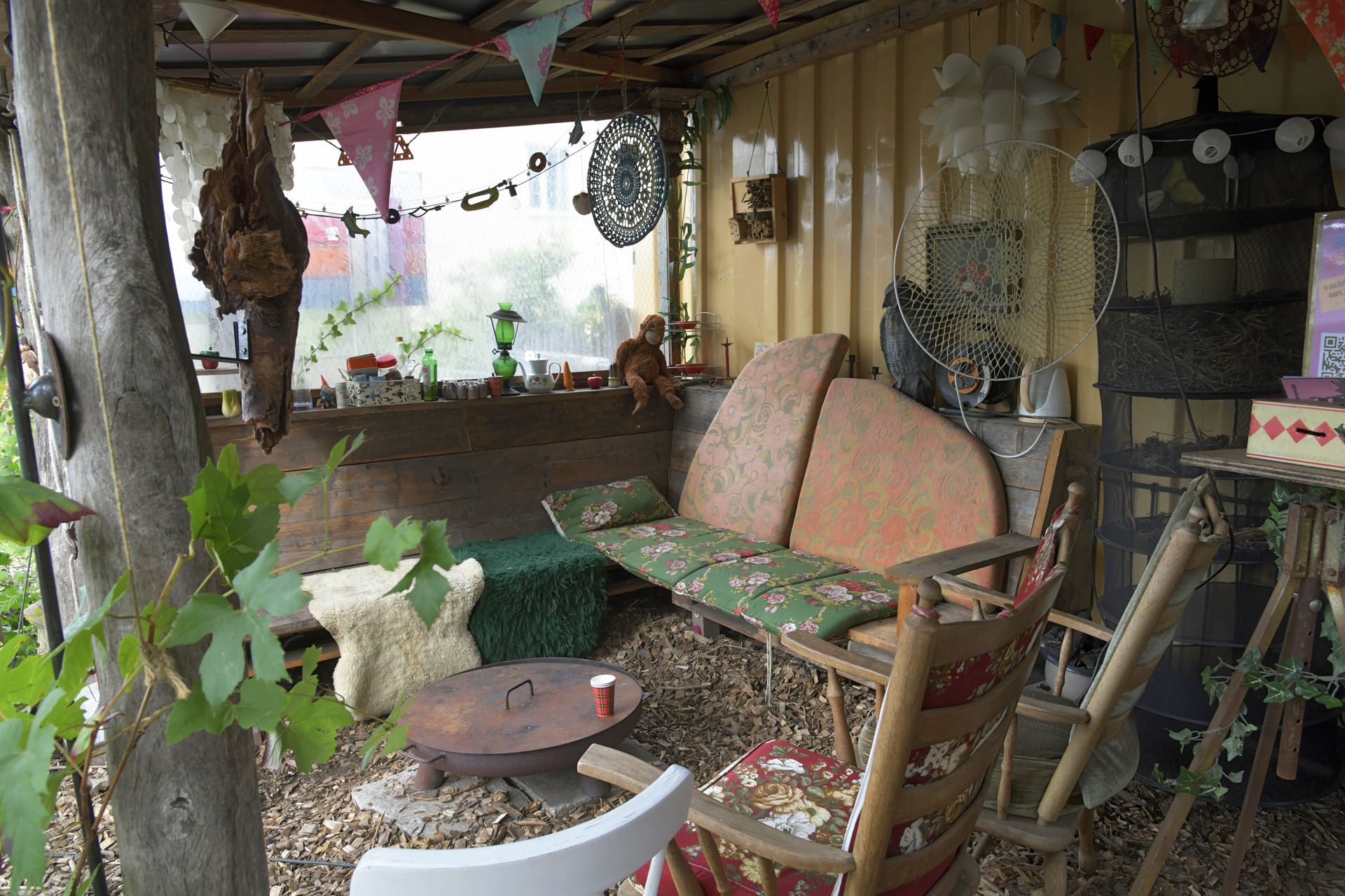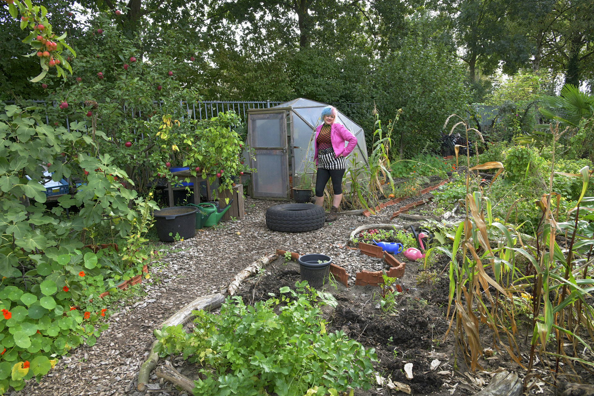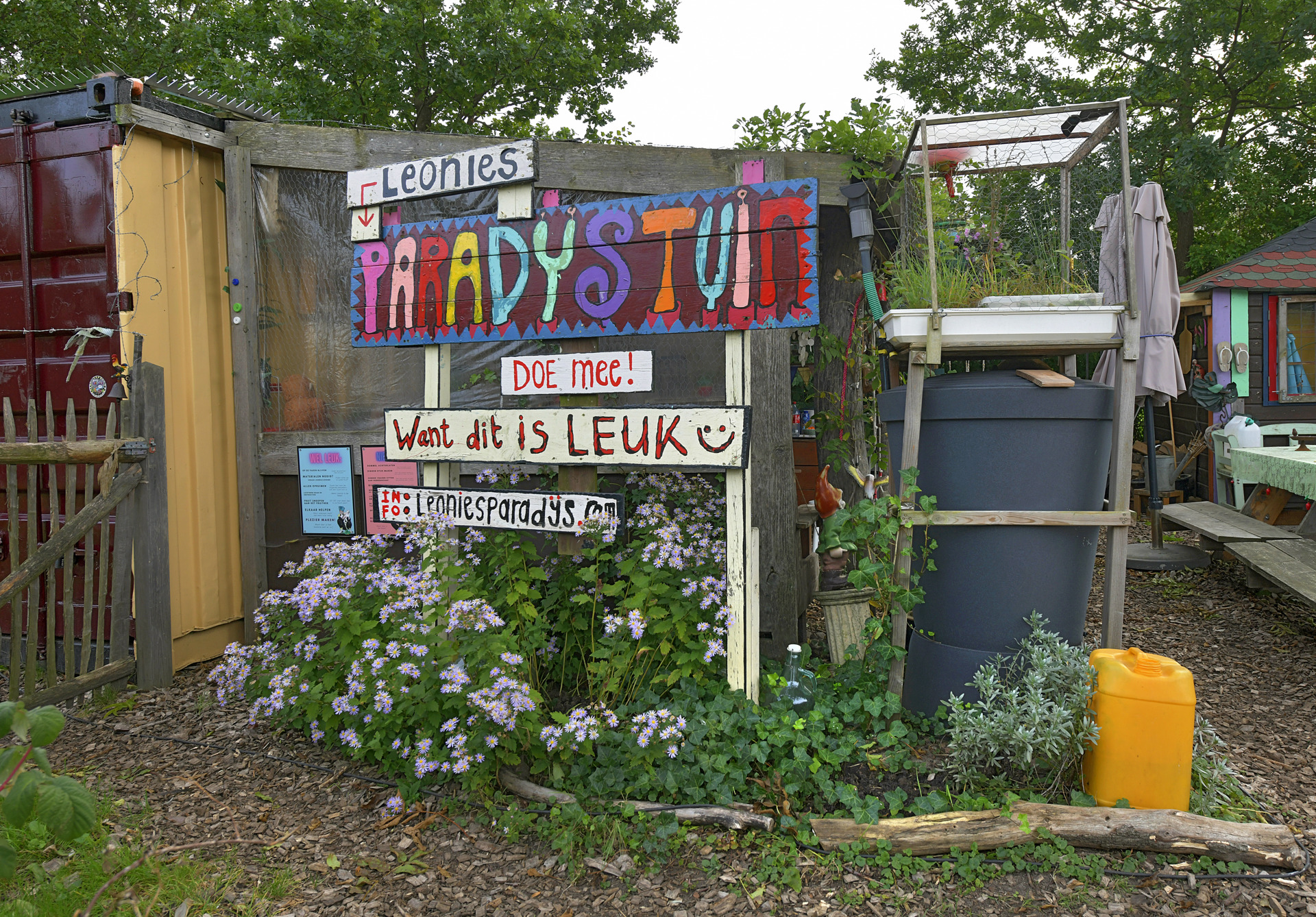 Kunstenares Leonie begon haar Paradijstuin zo’n vier jaar geleden. “Ik wilde een groene, duurzame ontmoetingsplek creëren waar ik mijn creativiteit helemaal in kwijt kon. Het begon met zand en daaromheen wat bamboestokken met afzetlint. Nu is het een kleurrijke plek waar prachtige bloemen staan, lekkere groenten groeien en waar iedereen van mee mag genieten.”