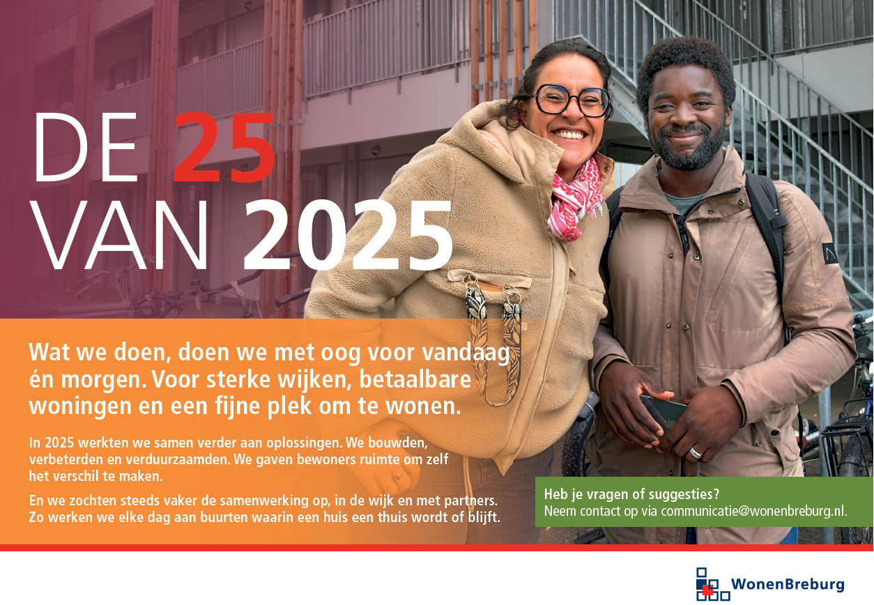 Wat we doen, doen we met oog voor vandaag én morgen. In 2025 werkten we bij WonenBreburg samen aan sterke wijken, betaalbare woningen en fijne plekken om te wonen. We bouwden, verbeterden en verduurzaamden. We gaven bewoners ruimte om zelf het verschil te maken.