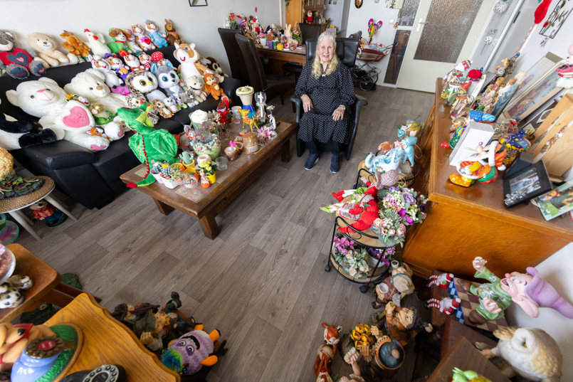 Haar bank is volledig bezet door tientallen knuffels. Beren, hondjes, uilen, een panter en véél supermarkthamsters. “Ze houden de bank lekker warm. Alleen als er bezoek komt, moeten ze soms even ergens anders gaan zitten. Ze maken het hier extra gezellig! Ik heb mijn collectie heel geleidelijk uitgebreid en nu is het inderdaad flink druk hier.”
