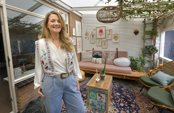 Joyce werkt als kunstenaar en illustrator. Dat is ook wel te zien aan haar interieur. Veel maakte ze zelf. En wat